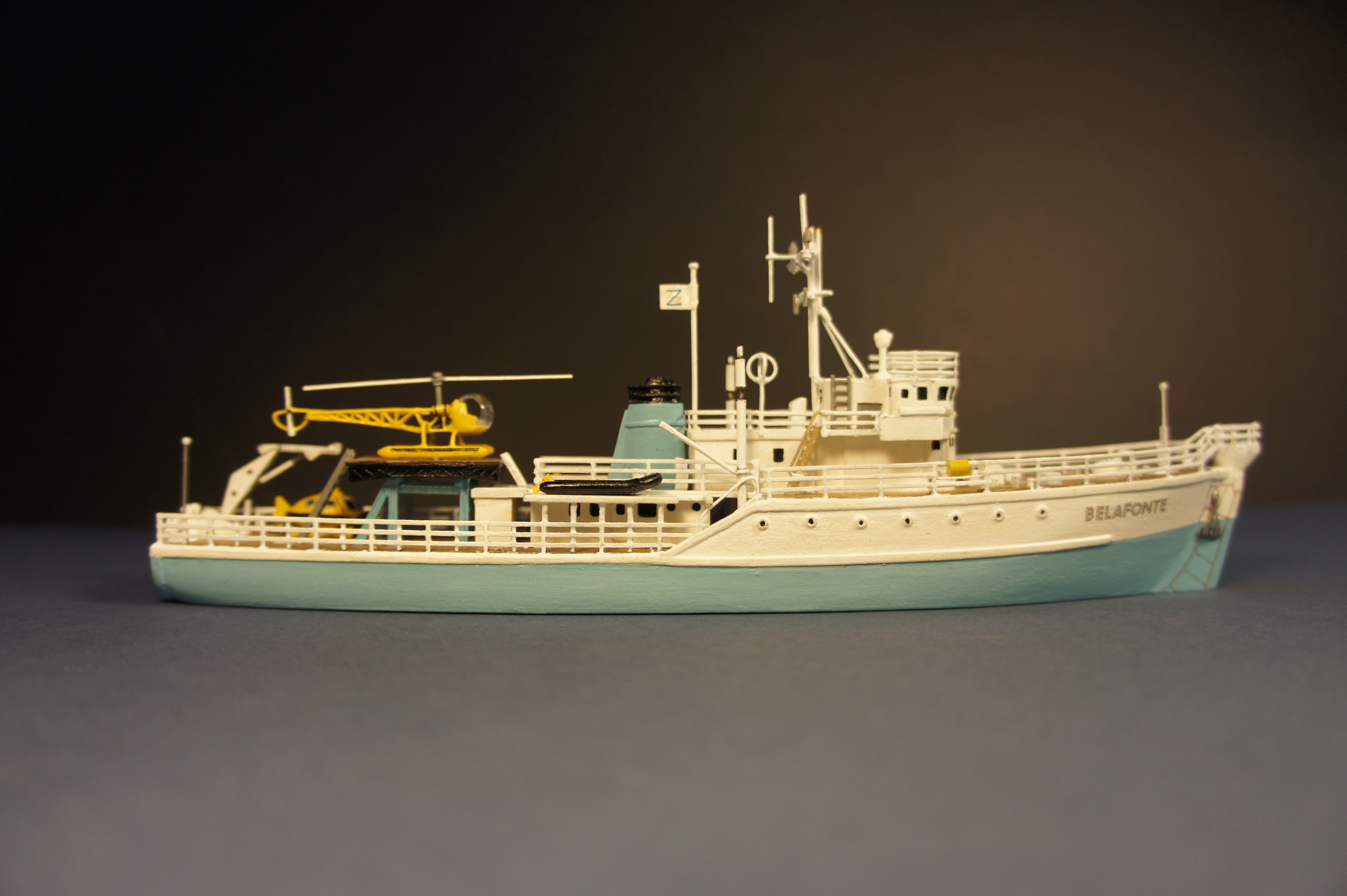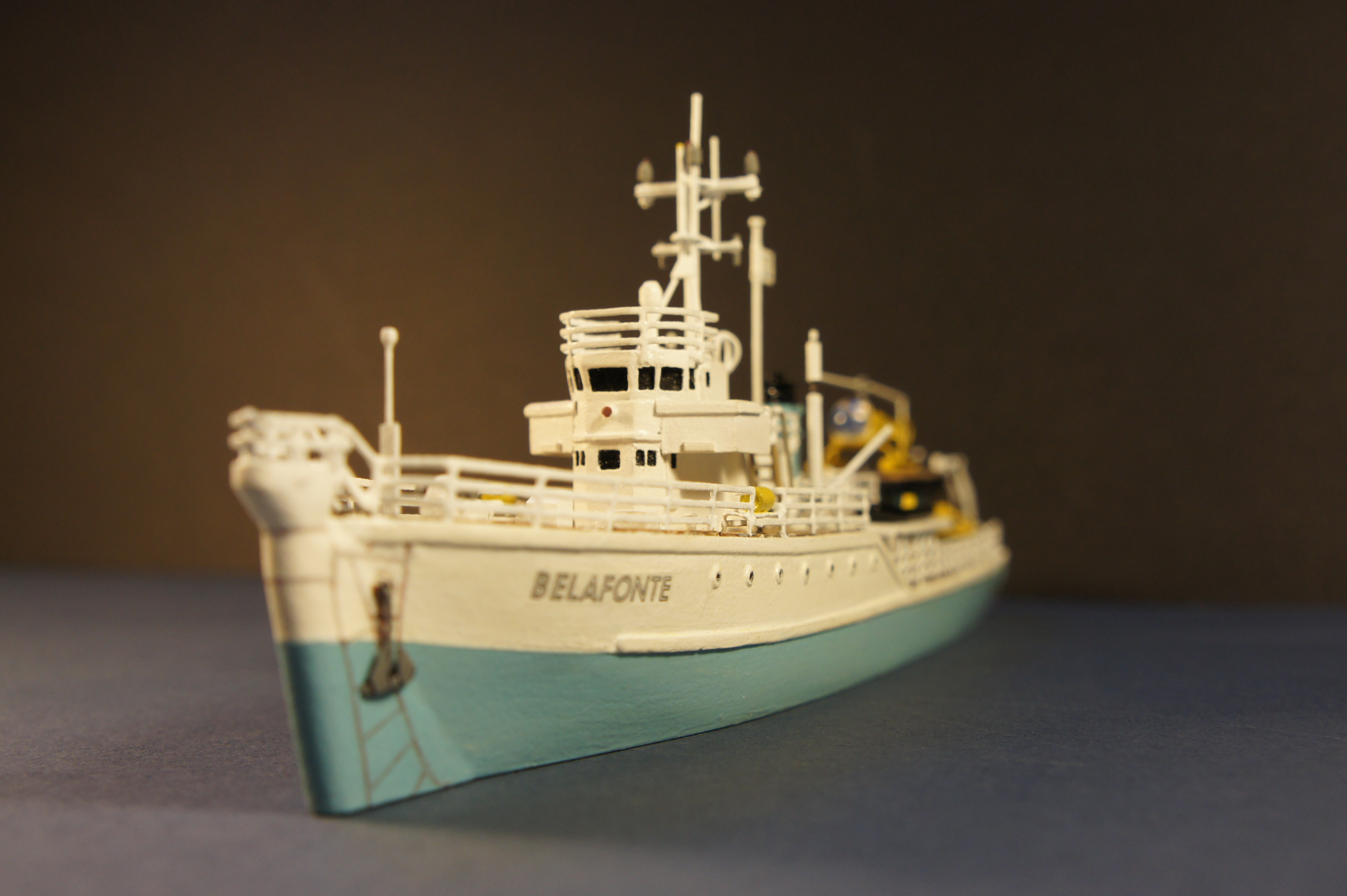 A waterline ship model of the Belafonte from The Life Aquatic with Steve Zissou by Wes Andeson.  This was made as a commission at 1:220 scale from boxwood, with laser cut details, custom decals and brass etched rails.