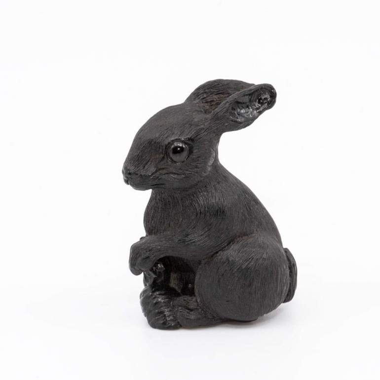 This rabbit has been caught in the act of stealing vegetables and is about to take flight. Made from ebony with inlaid eyes of horn and jet i spent many months trying to capture the right pose and startled expression. It stands 38mm tall 28mm deep. Pictures documenting its making can be found on my Instagram account.